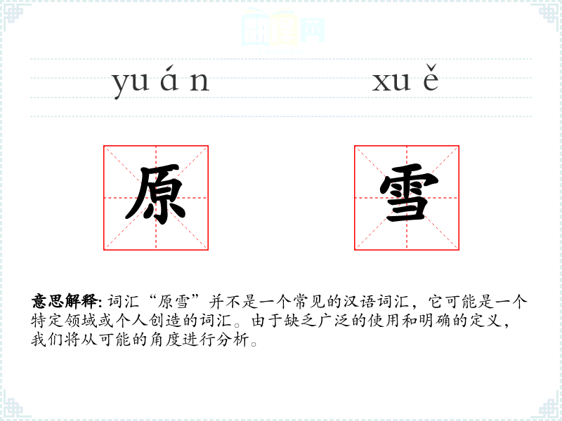 由于“原雪”不是一个标准词汇,它的使用可能局限于特定文学作品、诗歌或个人创作中,用以表达对自然美的赞美或对纯净状态的向往。