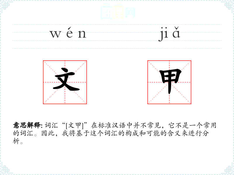 词汇“[文甲]”在标准汉语中并不常见,它不是一个常用的词汇。因此,我将基于这个词汇的构成和可能的含义来进行分析。