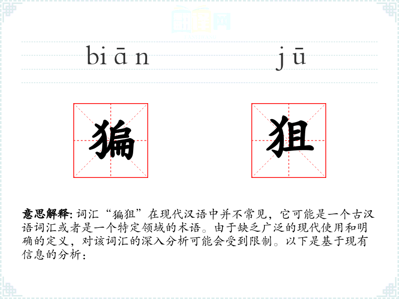 由于“猵狙”在现代语境中不常见,它的使用可能局限于特定的文学作品、历史文献或专业领域。在古汉语中,它可能指的是某种动物、器物或抽象概念。