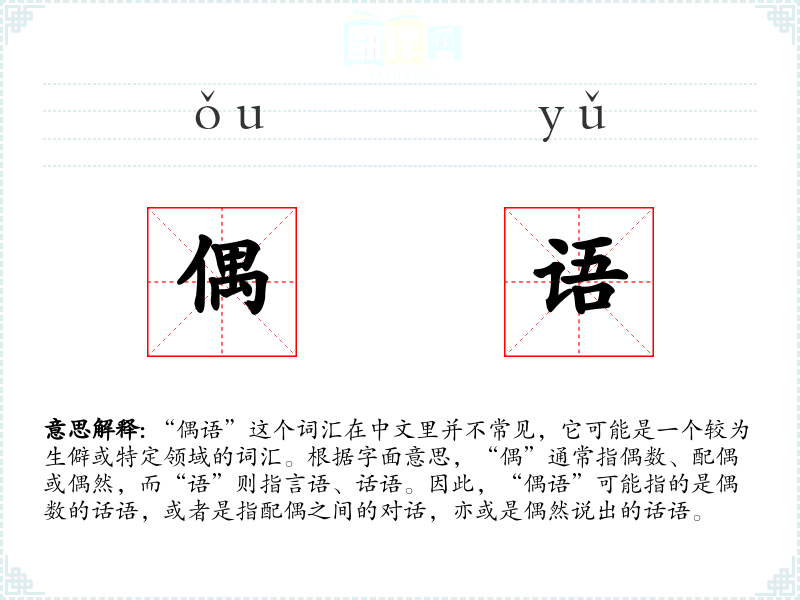由于“偶语”不是一个常用词汇,它在不同语言或文化中的对应词汇可能较为有限。在其他语言中,可能没有直接对应的词汇,需要根据具体的语境来翻译。