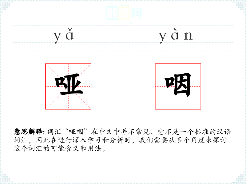 词汇“哑咽”在中文中并不常见,它不是一个标准的汉语词汇,因此在进行深入学习和分析时,我们需要从多个角度来探讨这个词汇的可能含义和用法。