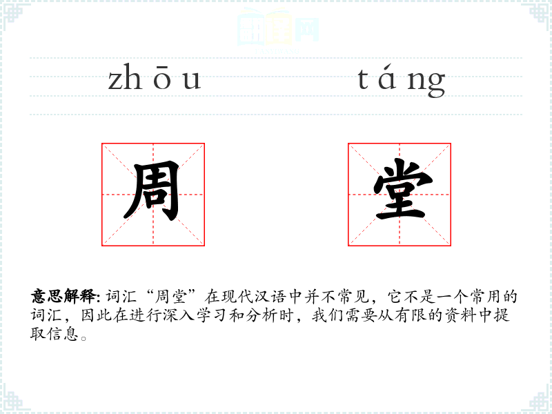 词汇“周堂”在现代汉语中并不常见,它不是一个常用的词汇,因此在进行深入学*和分析时,我们需要从有限的资料中提取信息。