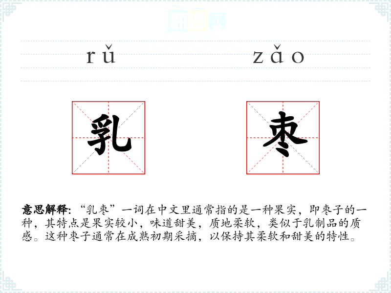 “乳枣”一词在中文里通常指的是一种果实,即枣子的一种,其特点是果实较小,味道甜美,质地柔软,类似于乳制品的质感。这种枣子通常在成熟初期采摘,以保持其柔软和甜美的特性。