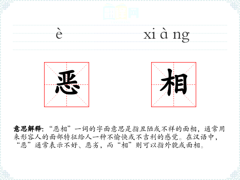 “恶相”一词的字面意思是指丑陋或不祥的面相,通常用来形容人的面部特征给人一种不愉快或不吉利的感觉。在汉语中,“恶”通常表示不好、恶劣,而“相”则可以指外貌或面相。