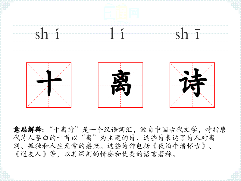 在文学语境中,“十离诗”常被用来指代李白的这十首诗,作为研究李白诗歌风格和情感表达的重要材料。在口语中,这个词汇可能不太常用,但在文学研究和教育中,它是一个重要的术语。