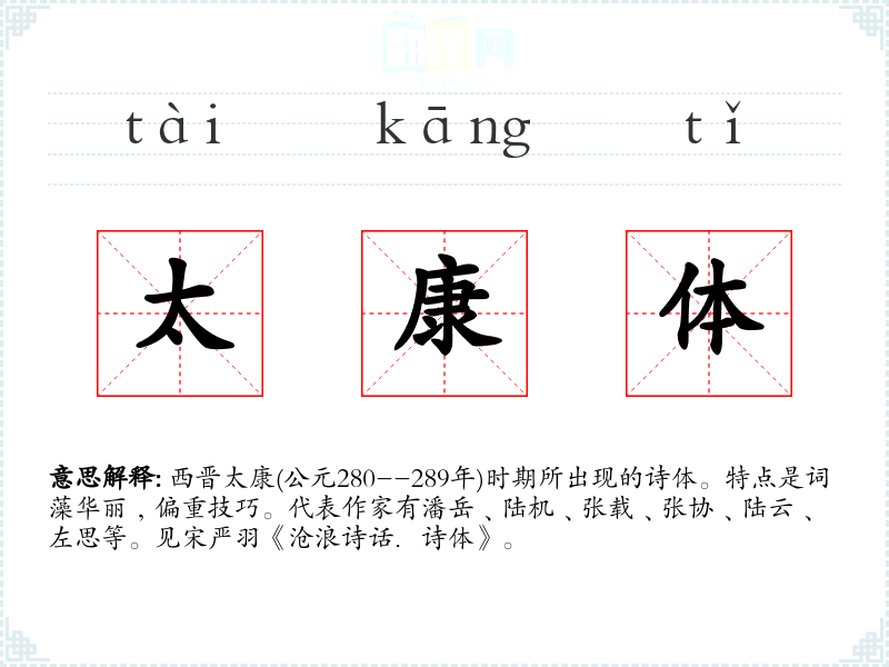 西晋太康(公元280--289年)时期所出现的诗体。特点是词藻华丽﹐偏重技巧。代表作家有潘岳﹑陆机﹑张载﹑张协﹑陆云﹑左思等。见宋严羽《沧浪诗话.诗体》。