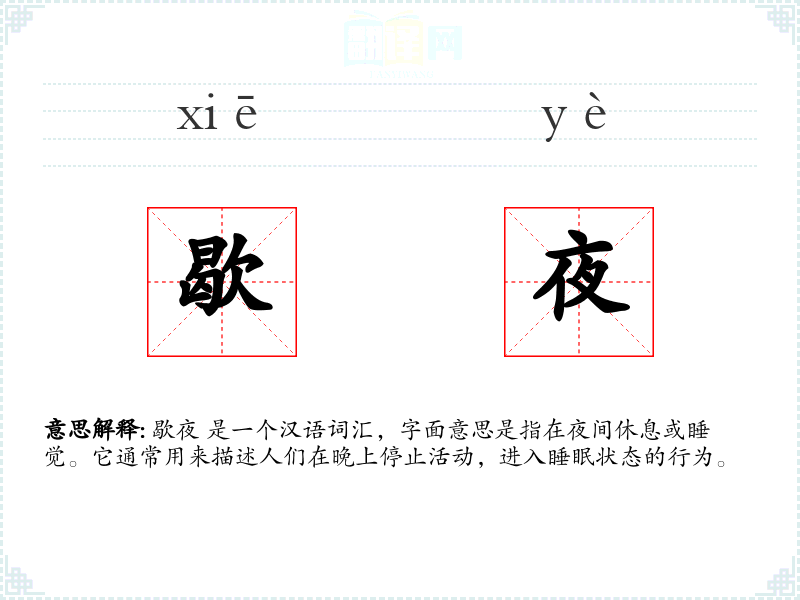 “歇夜”一词的词源较为直接,由“歇”(休息)和“夜”(夜晚)组成。在古代汉语中,人们常用“歇”来表示休息,而“夜”则指夜晚,两者结合形成了“歇夜”这一词汇。随着时间的推移,其基本含义保持不变,但在现代汉语中使用频率可能有所下降。