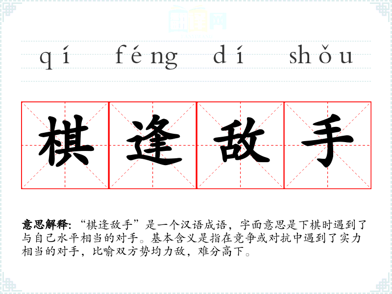 “棋逢敌手”是一个汉语成语,字面意思是下棋时遇到了与自己水平相当的对手。基本含义是指在竞争或对抗中遇到了实力相当的对手,比喻双方势均力敌,难分高下。