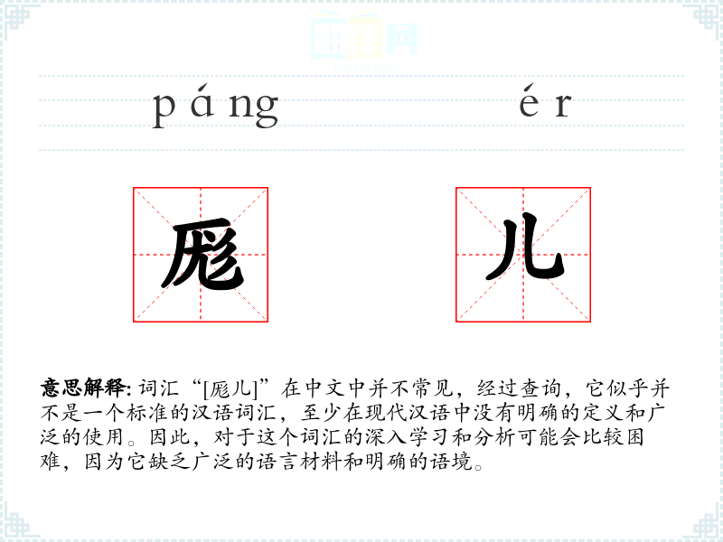 词汇“[厖儿]”在中文中并不常见,经过查询,它似乎并不是一个标准的汉语词汇,至少在现代汉语中没有明确的定义和广泛的使用。因此,对于这个词汇的深入学习和分析可能会比较困难,因为它缺乏广泛的语言材料和明确的语境。