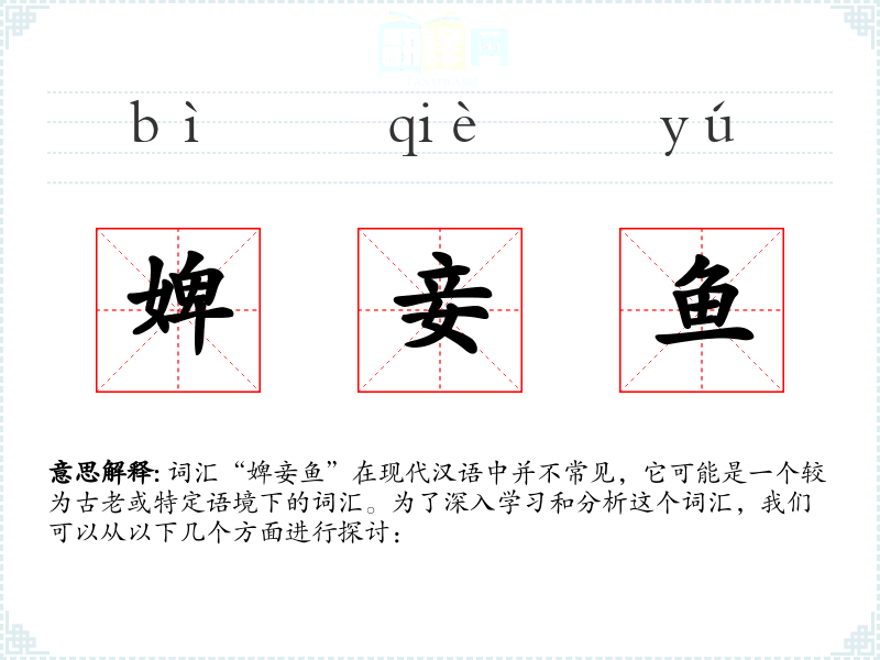 词汇“婢妾鱼”在现代汉语中并不常见,它可能是一个较为古老或特定语境下的词汇。为了深入学*和分析这个词汇,我们可以从以下几个方面进行探讨: