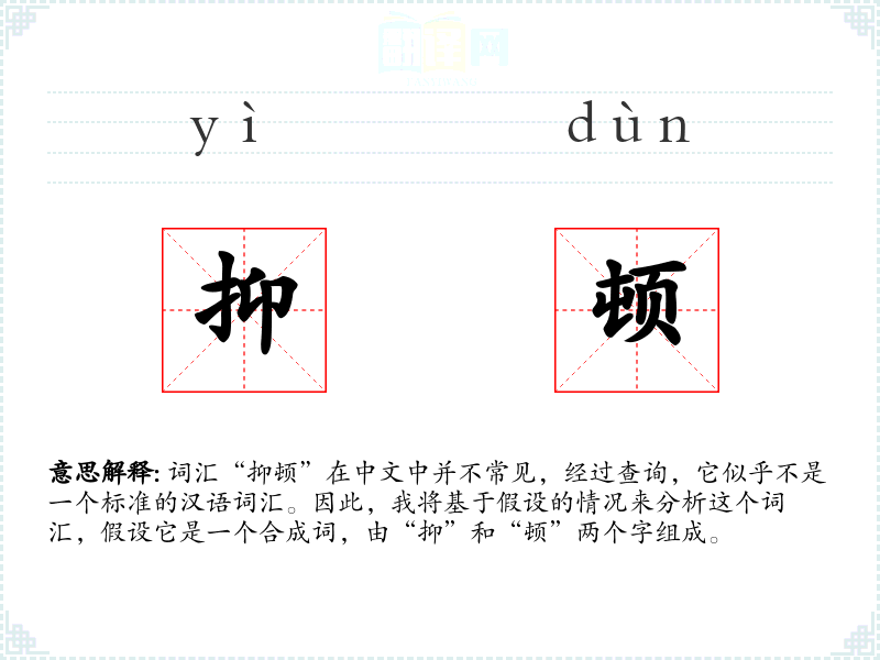 词汇“抑顿”在中文中并不常见,经过查询,它似乎不是一个标准的汉语词汇。因此,我将基于假设的情况来分析这个词汇,假设它是一个合成词,由“抑”和“顿”两个字组成。