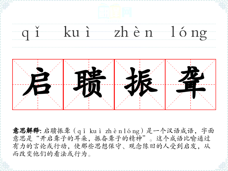 启聩振聋(qǐ kuì zhèn lóng)是一个汉语成语,字面意思是“开启聋子的耳朵,振奋聋子的精神”。这个成语比喻通过有力的言论或行动,使那些思想保守、观念陈旧的人受到启发,从而改变他们的看法或行为。