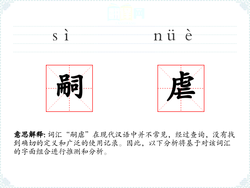 由于“嗣虐”不是一个常用词汇,其词源和演变难以考证。但从字面组合来看,它可能是由“嗣”和“虐”两个常用汉字组合而成,用以表达特定的负面继承行为。