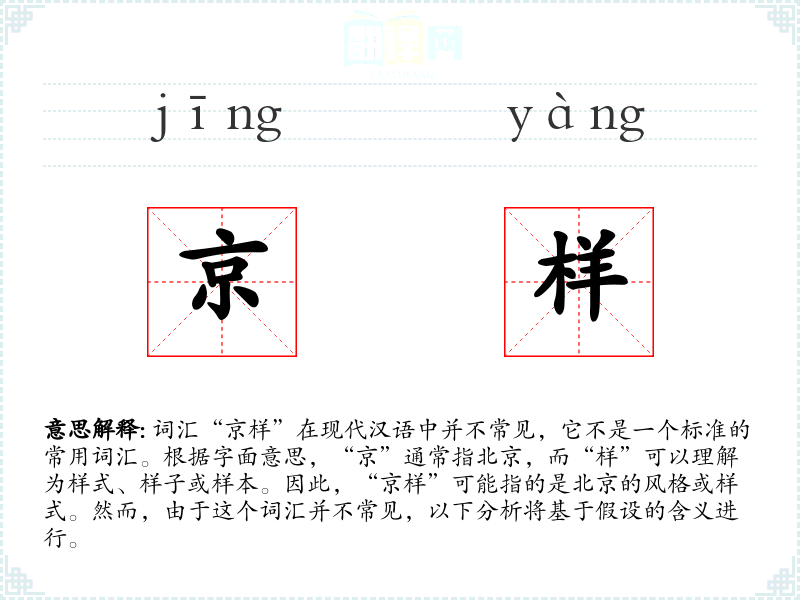 词汇“京样”在现代汉语中并不常见,它不是一个标准的常用词汇。根据字面意思,“京”通常指北京,而“样”可以理解为样式、样子或样本。因此,“京样”可能指的是北京的风格或样式。然而,由于这个词汇并不常见,以下分析将基于假设的含义进行。