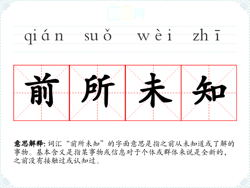 “前所未知”由“前所未”和“知”两个部分组成,其中“前所未”表示时间上的之前未有,“知”表示知道或了解。这个词组在中文中的使用历史悠久,但其具体起源难以追溯。
