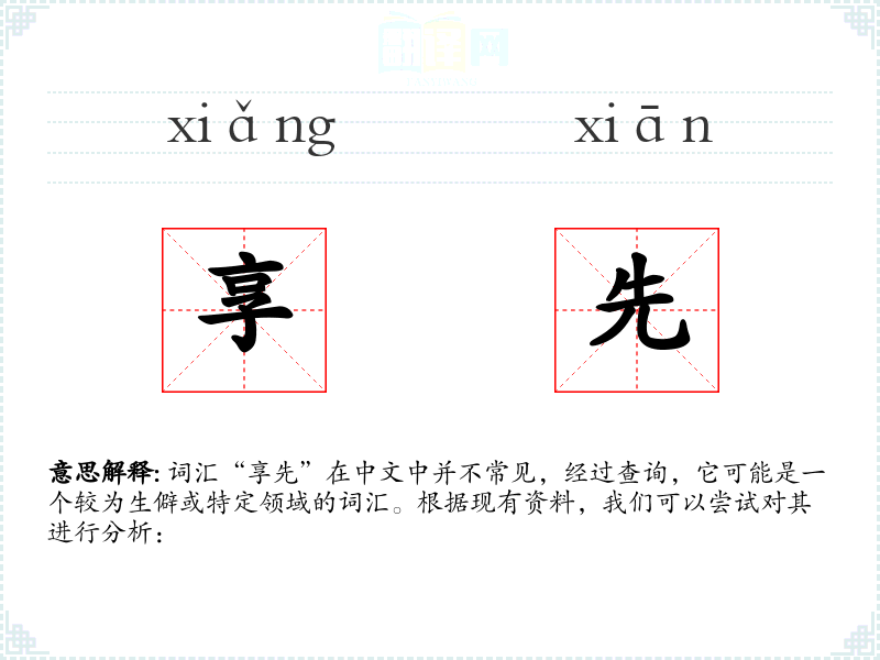 词汇“享先”在中文中并不常见,经过查询,它可能是一个较为生僻或特定领域的词汇。根据现有资料,我们可以尝试对其进行分析: