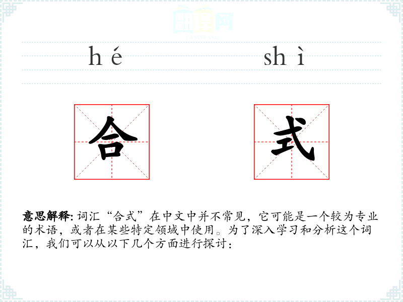 词汇“合式”在中文中并不常见,它可能是一个较为专业的术语,或者在某些特定领域中使用。为了深入学习和分析这个词汇,我们可以从以下几个方面进行探讨: