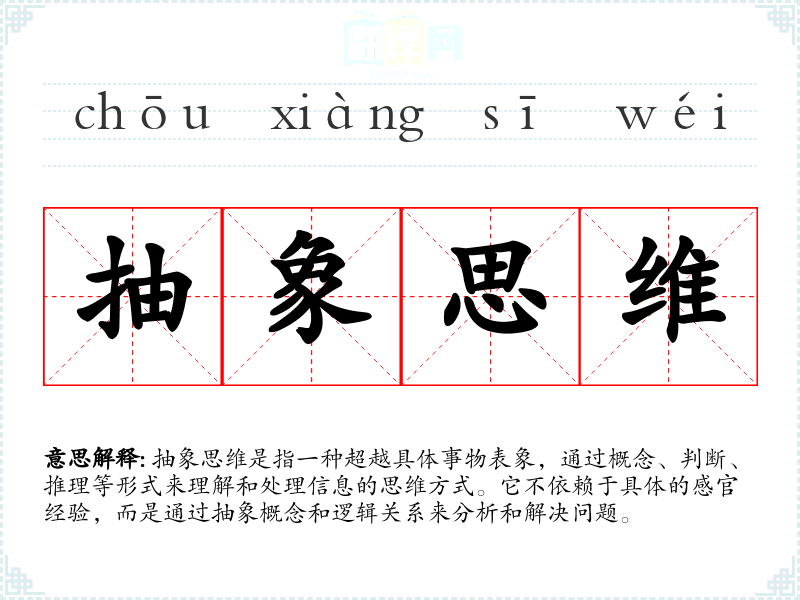 抽象思维是指一种超越具体事物表象,通过概念、判断、推理等形式来理解和处理信息的思维方式。它不依赖于具体的感官经验,而是通过抽象概念和逻辑关系来分析和解决问题。