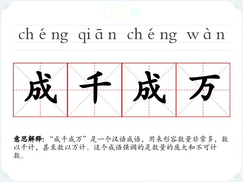 “成千成万”是一个汉语成语,用来形容数量非常多,数以千计,甚至数以万计。这个成语强调的是数量的庞大和不可计数。