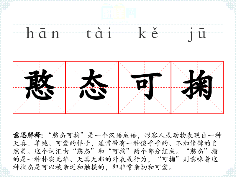 “憨态可掬”是一个汉语成语,形容人或动物表现出一种天真、单纯、可爱的样子,通常带有一种傻乎乎的、不加修饰的自然美。这个词汇由“憨态”和“可掬”两个部分组成。“憨态”指的是一种朴实无华、天真无邪的外表或行为,“可掬”则意味着这种状态是可以被亲近和触摸的,即非常亲切和可爱。