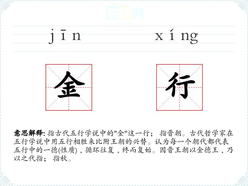 指古代五行学说中的"金"这一行; 指晋朝。古代哲学家在五行学说中用五行相胜来比附王朝的兴替。认为每一个朝代都代表五行中的一德(性质)﹐