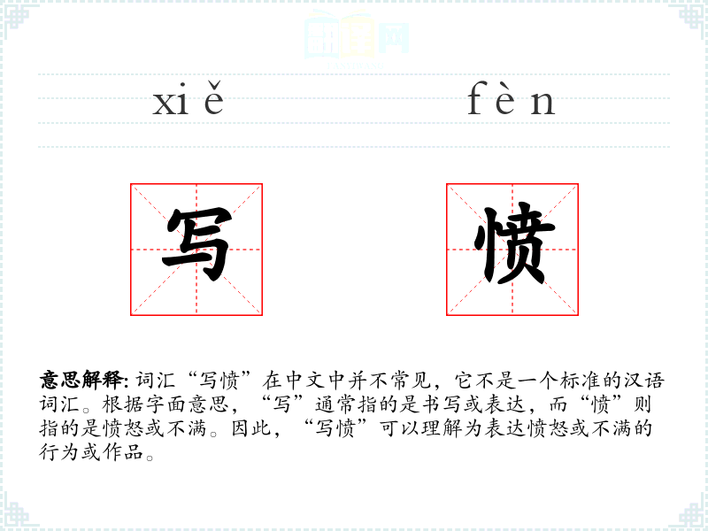 词汇“写愤”在中文中并不常见,它不是一个标准的汉语词汇。根据字面意思,“写”通常指的是书写或表达,而“愤”则指的是愤怒或不满。因此,“写愤”可以理解为表达愤怒或不满的行为或作品。