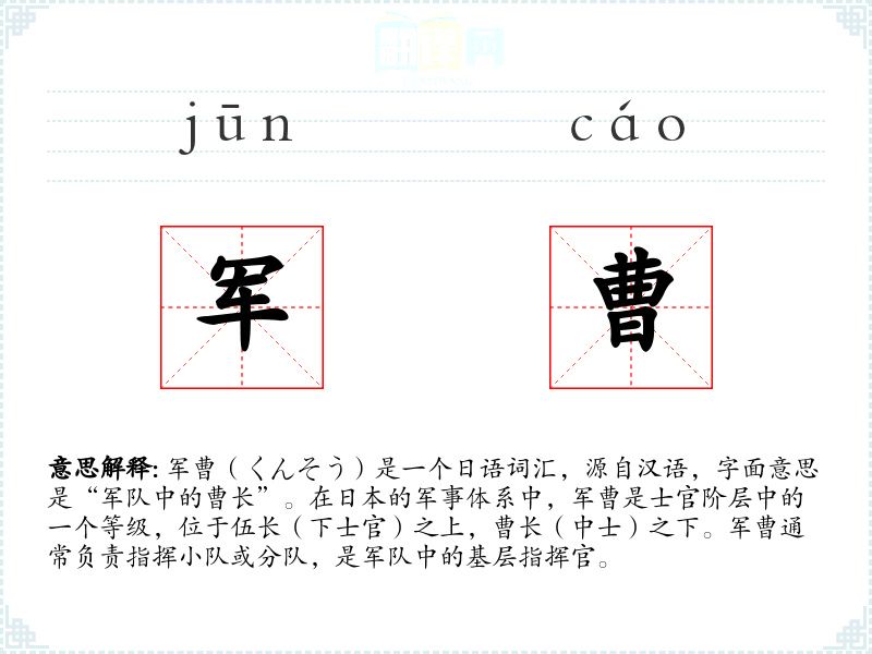 军曹(くんそう)是一个日语词汇,源自汉语,字面意思是“军队中的曹长”。在日本的军事体系中,军曹是士官阶层中的一个等级,位于伍长(下士官)之上,曹长(中士)之下。军曹通常负责指挥小队或分队,是军队中的基层指挥官。