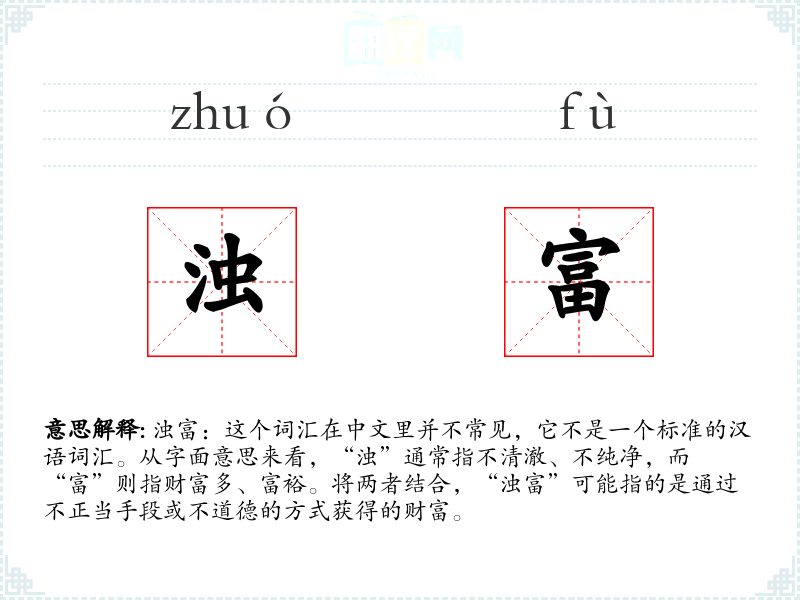 浊富:这个词汇在中文里并不常见,它不是一个标准的汉语词汇。从字面意思来看,“浊”通常指不清澈、不纯净,而“富”则指财富多、富裕。将两者结合,“浊富”可能指的是通过不正当手段或不道德的方式获得的财富。