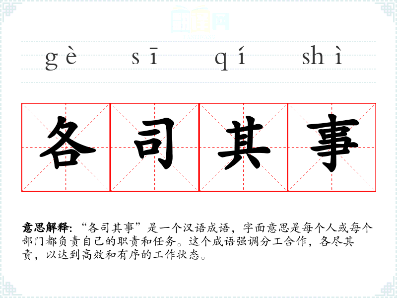 “各司其事”是一个汉语成语,字面意思是每个人或每个部门都负责自己的职责和任务。这个成语强调分工合作,各尽其责,以达到高效和有序的工作状态。