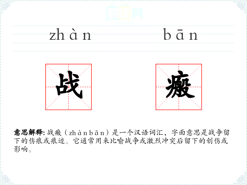 战瘢(zhàn bān)是一个汉语词汇,字面意思是战争留下的伤痕或痕迹。它通常用来比喻战争或激烈冲突后留下的创伤或影响。