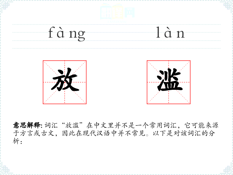 词汇“放滥”在中文里并不是一个常用词汇,它可能来源于方言或古文,因此在现代汉语中并不常见。以下是对该词汇的分析: