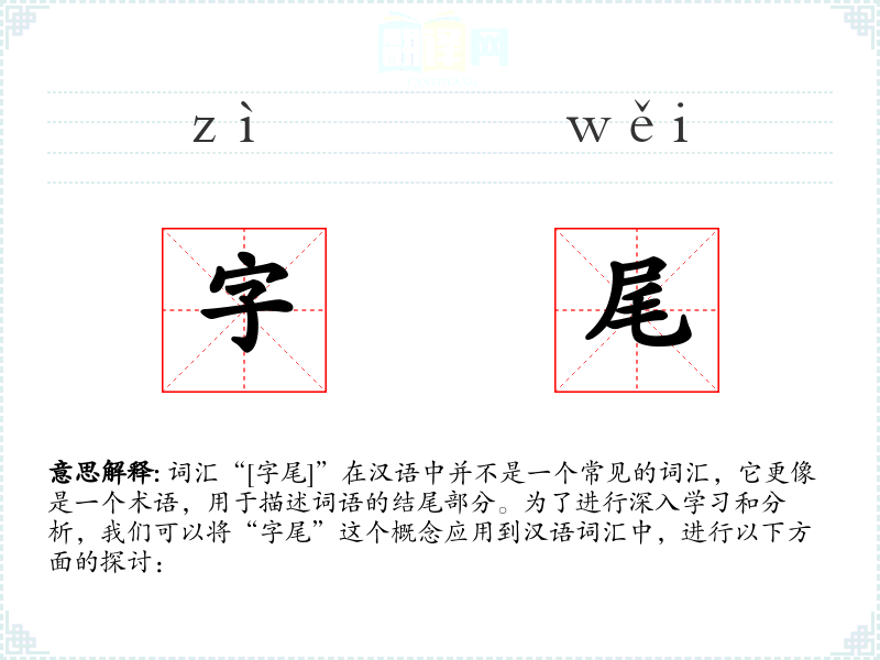 词汇“[字尾]”在汉语中并不是一个常见的词汇,它更像是一个术语,用于描述词语的结尾部分。为了进行深入学习和分析,我们可以将“字尾”这个概念应用到汉语词汇中,进行以下方面的探讨: