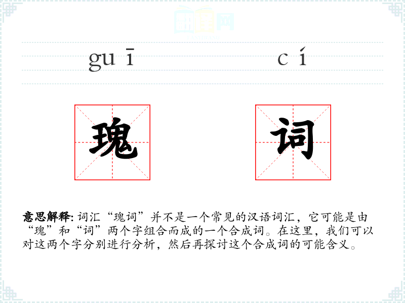 结合这两个字,“瑰词”可以理解为指那些美丽、珍奇、不寻常的词汇,或者是指在文学作品中使用的富有艺术性和表现力的词汇。