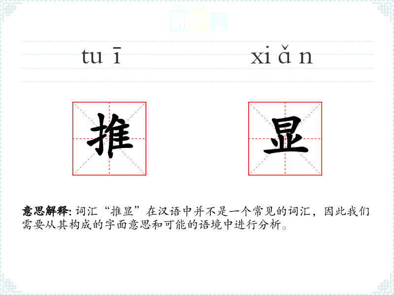 词汇“推显”在汉语中并不是一个常见的词汇,因此我们需要从其构成的字面意思和可能的语境中进行分析。