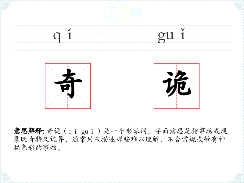 奇诡(qí guǐ)是一个形容词,字面意思是指事物或现象既奇特又诡异,通常用来描述那些难以理解、不合常规或带有神秘色彩的事物。