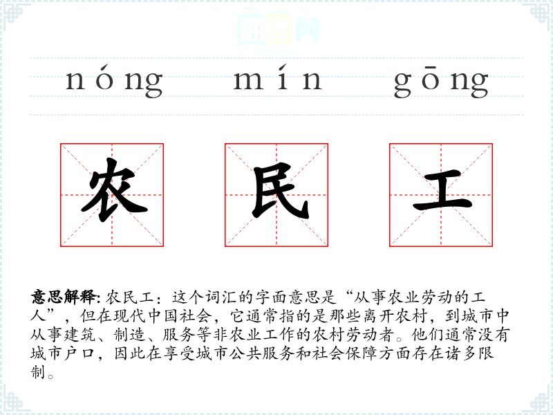 农民工:这个词汇的字面意思是“从事农业劳动的工人”,但在现代**社会,它通常指的是那些离开农村,到城市中从事建筑、制造、服务等非农业工作的农村劳动者。他们通常没有城市户口,因此在享受城市公共服务和社会保障方面存在诸多限制。