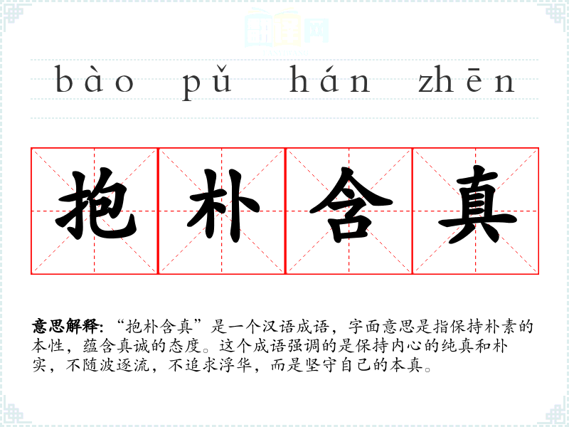 “抱朴含真”是一个汉语成语,字面意思是指保持朴素的本性,蕴含真诚的态度。这个成语强调的是保持内心的纯真和朴实,不随波逐流,不追求浮华,而是坚守自己的本真。