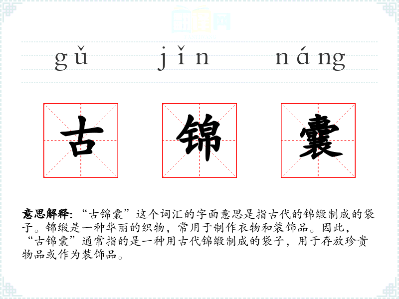 在其他文化中,类似的词汇可能是“古绣袋”或“古织袋”,但这些词汇不一定强调材质的华丽和历史的沉淀。例如,在欧洲文化中,类似的物品可能是用丝绸或其他珍贵材料制成的袋子,但不一定被称为“古锦囊”。