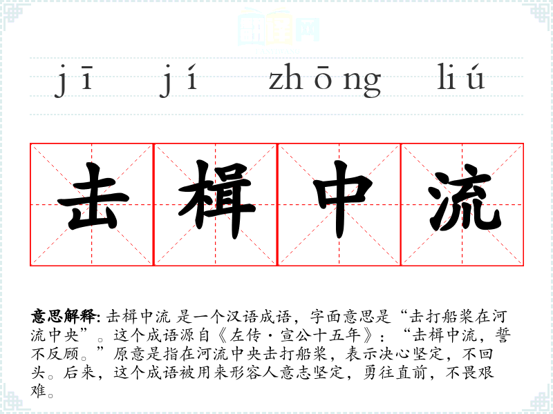 击楫中流 是一个汉语成语,字面意思是“击打船桨在河流中央”。这个成语源自《左传·宣公十五年》:“击楫中流,誓不反顾。”原意是指在河流中央击打船桨,表示决心坚定,不回头。后来,这个成语被用来形容人意志坚定,勇往直前,不畏艰难。