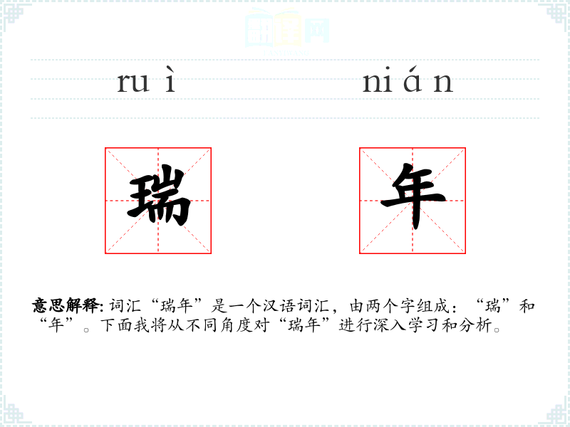 - 字面意思:“瑞”通常指吉祥的征兆或象征,如“瑞雪”、“瑞气”等;“年”则是时间单位,指一年。