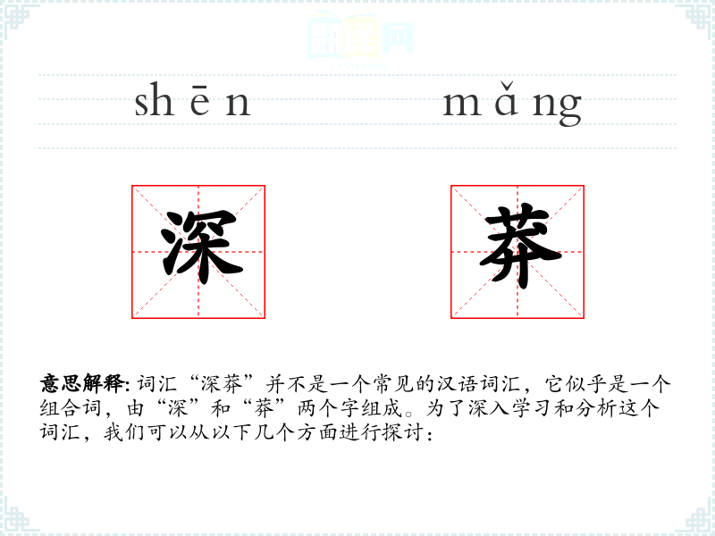 词汇“深莽”并不是一个常见的汉语词汇,它似乎是一个组合词,由“深”和“莽”两个字组成。为了深入学习和分析这个词汇,我们可以从以下几个方面进行探讨: