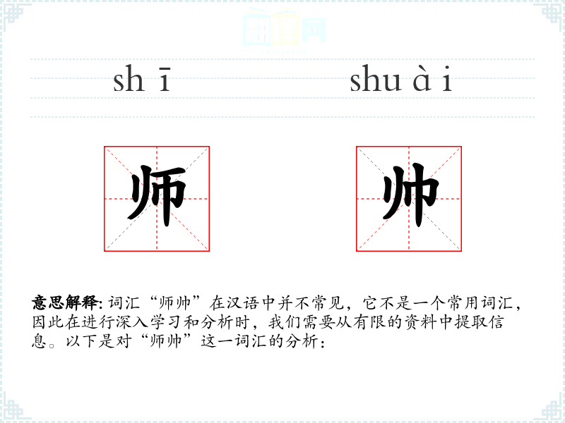 词汇“师帅”在汉语中并不常见,它不是一个常用词汇,因此在进行深入学*和分析时,我们需要从有限的资料中提取信息。以下是对“师帅”这一词汇的分析: