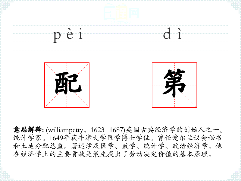 1.(williampetty,1623-1687)英国古典经济学的创始人之一。统计学家。1649年获牛津大学医学博士学位。曾任爱尔兰议会秘书和土地分配总监。著述涉及医学、数学、统计学、政治经济学。他在经济学上的主要贡献是最先提出了劳动决定价值的基本原理。