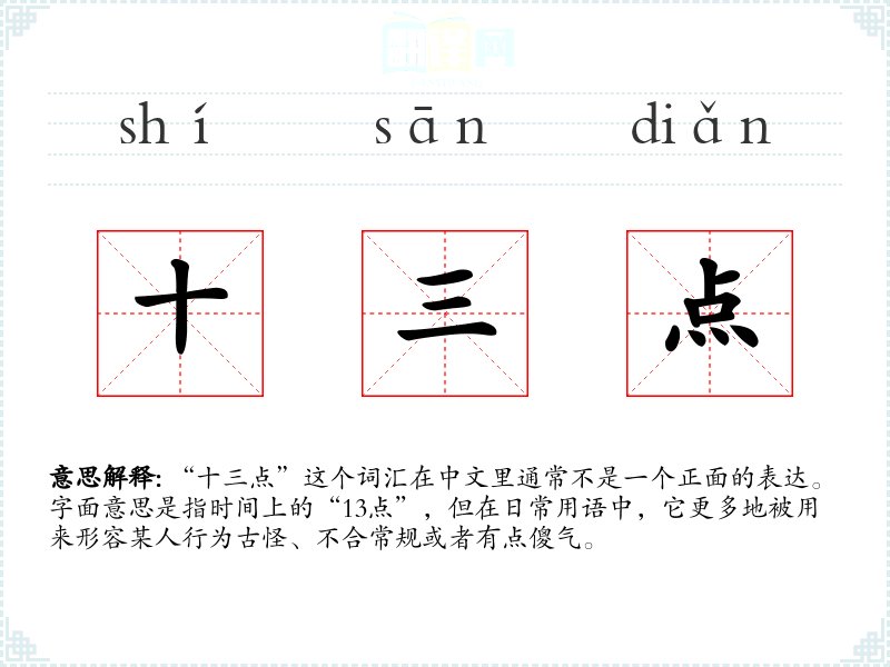 “十三点”这个词汇在中文里通常不是一个正面的表达。字面意思是指时间上的“13点”,但在日常用语中,它更多地被用来形容某人行为古怪、不合常规或者有点傻气。