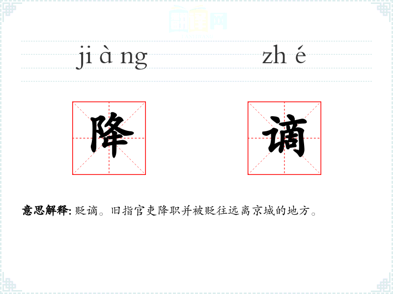 贬谪。旧指官吏降职并被贬往远离京城的地方。