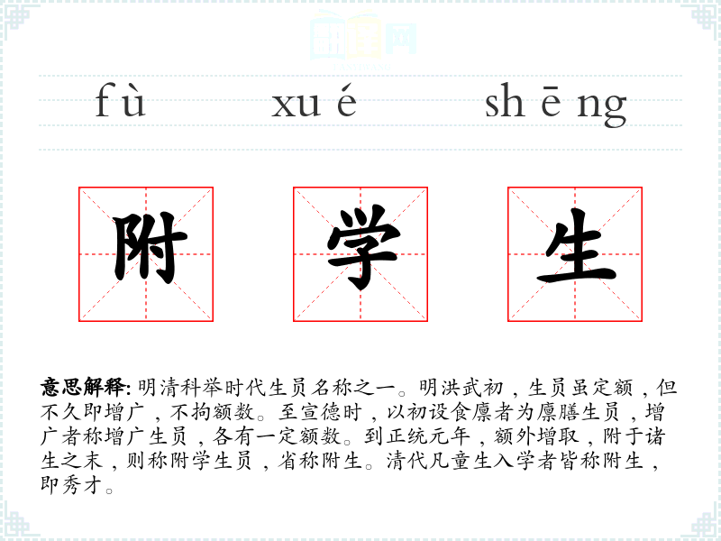 1.明清科举时代生员名称之一。明洪武初﹐生员虽定额﹐但不久即增广﹐不拘额数。至宣德时﹐以初设食廪者为廪膳生员﹐增广者称增广生员﹐各有一定额数。到正统元年﹐额外增取﹐附于诸生之末﹐则称附学生员﹐省称附生。清代凡童生入学者皆称附生﹐即秀才。