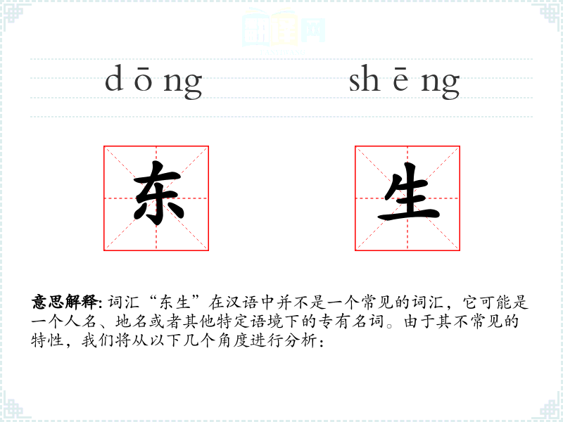 词汇“东生”在汉语中并不是一个常见的词汇,它可能是一个人名、地名或者其他特定语境下的专有名词。由于其不常见的特性,我们将从以下几个角度进行分析: