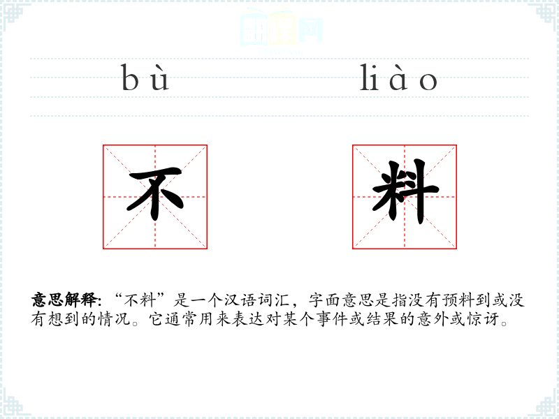 “不料”由“不”和“料”两个字组成。“不”表示否定,“料”表示预料或估计。在古代汉语中,“料”已有预料之意,而“不料”则是在近代汉语中逐渐形成的固定搭配,用以表达意外的情况。