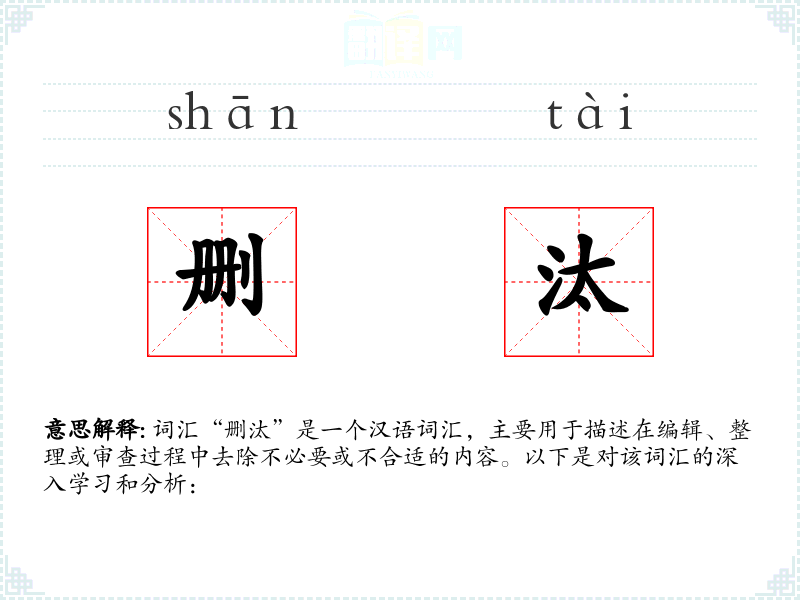 词汇“删汰”是一个汉语词汇,主要用于描述在编辑、整理或审查过程中去除不必要或不合适的内容。以下是对该词汇的深入学习和分析: