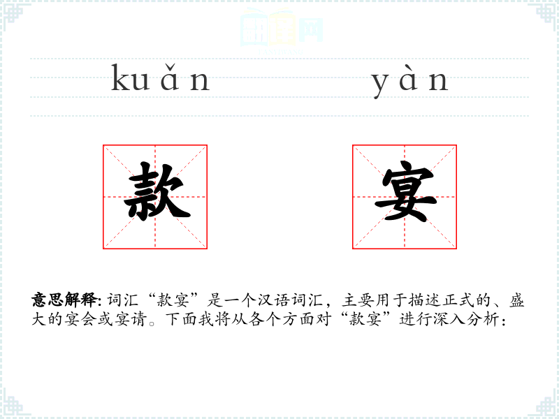 “款”字古汉语中有款待、招待之意,“宴”即宴会。两者结合,形成了“款宴”这一词汇,用以描述正式的宴请活动。
